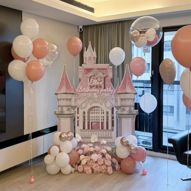 - 主角牆設計: 訂製含有壽星名字的「Happy Birthday」客製化背板,旁邊站立一隻與孩子身高相仿的造型氣球,童趣感十足。
