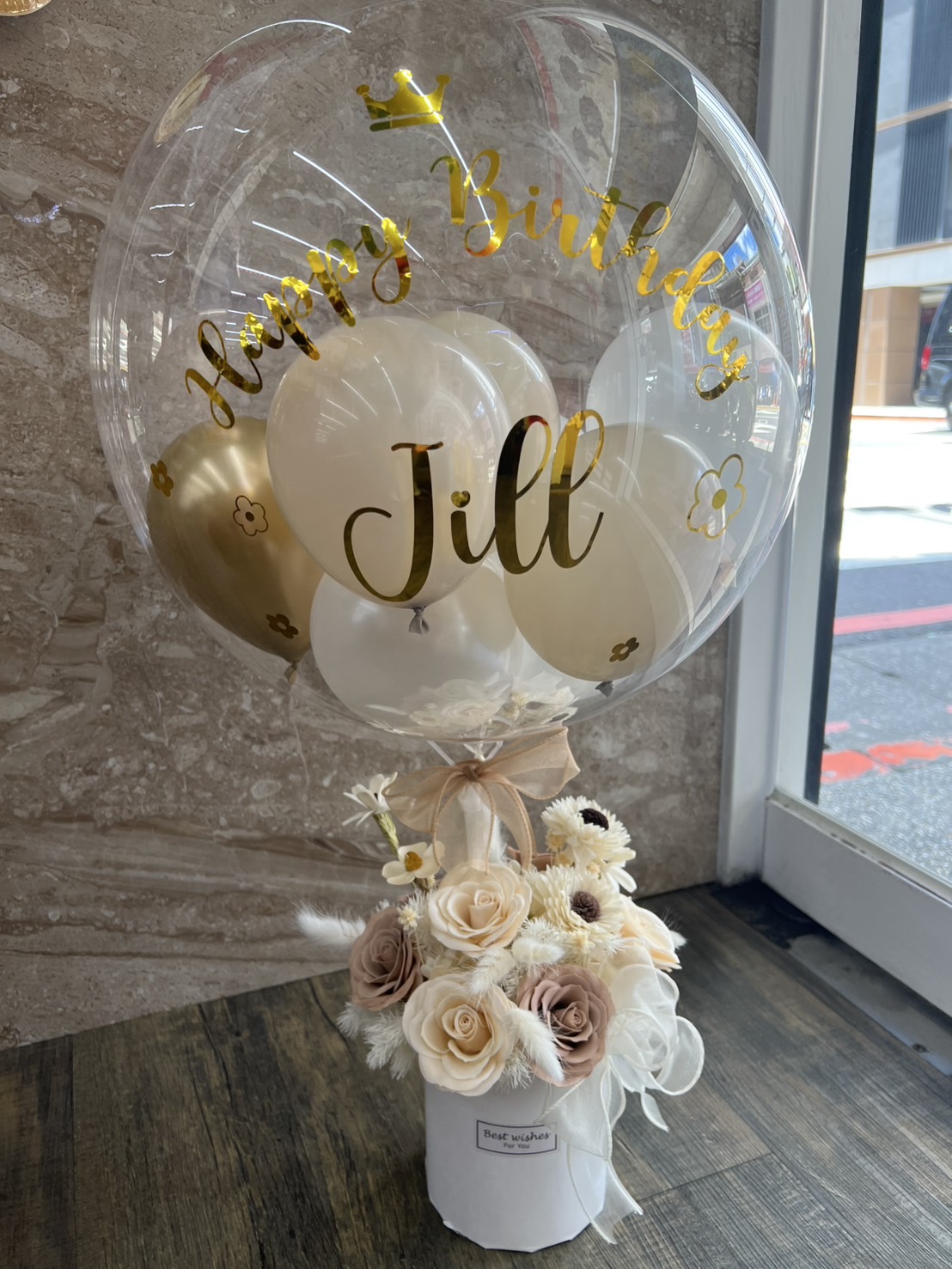 繽紛透明球內裝有客製文字、小禮物、乾燥花,禮物獨具巧思,帶給收禮者更多的驚喜,把驚喜保存於桶中,讓開箱成為一種浪漫儀式,詢問度超高的「氣球抱抱桶」!