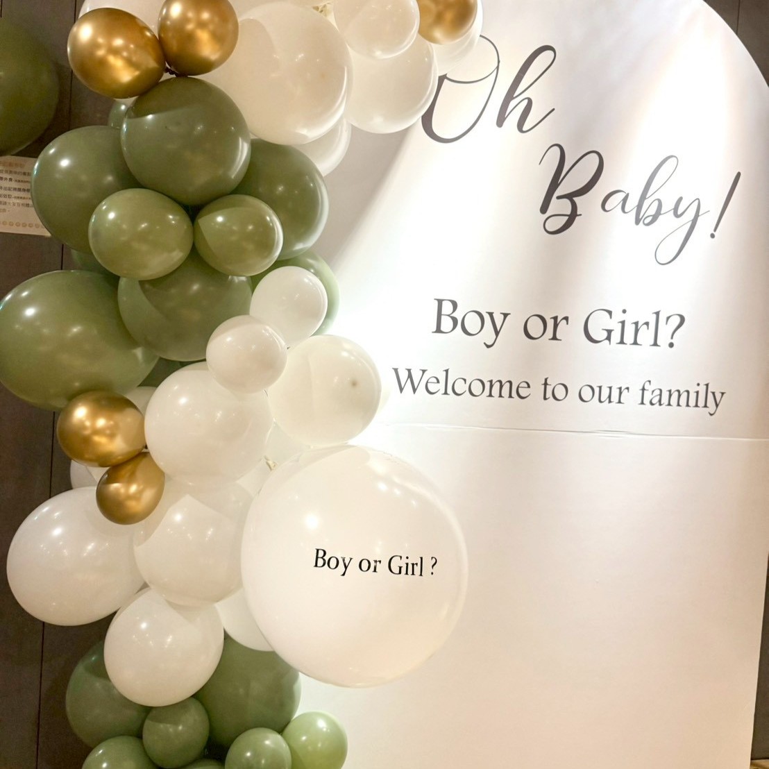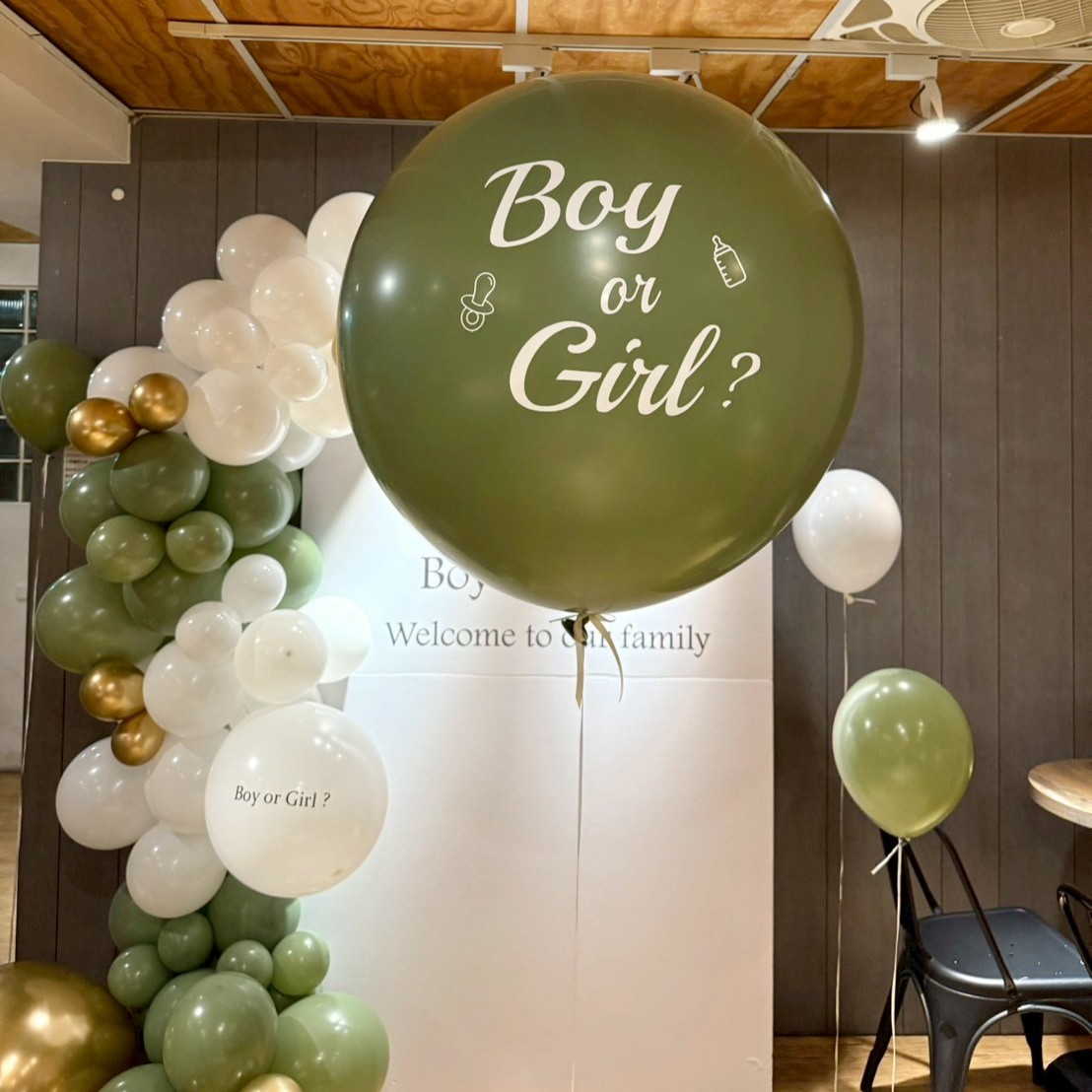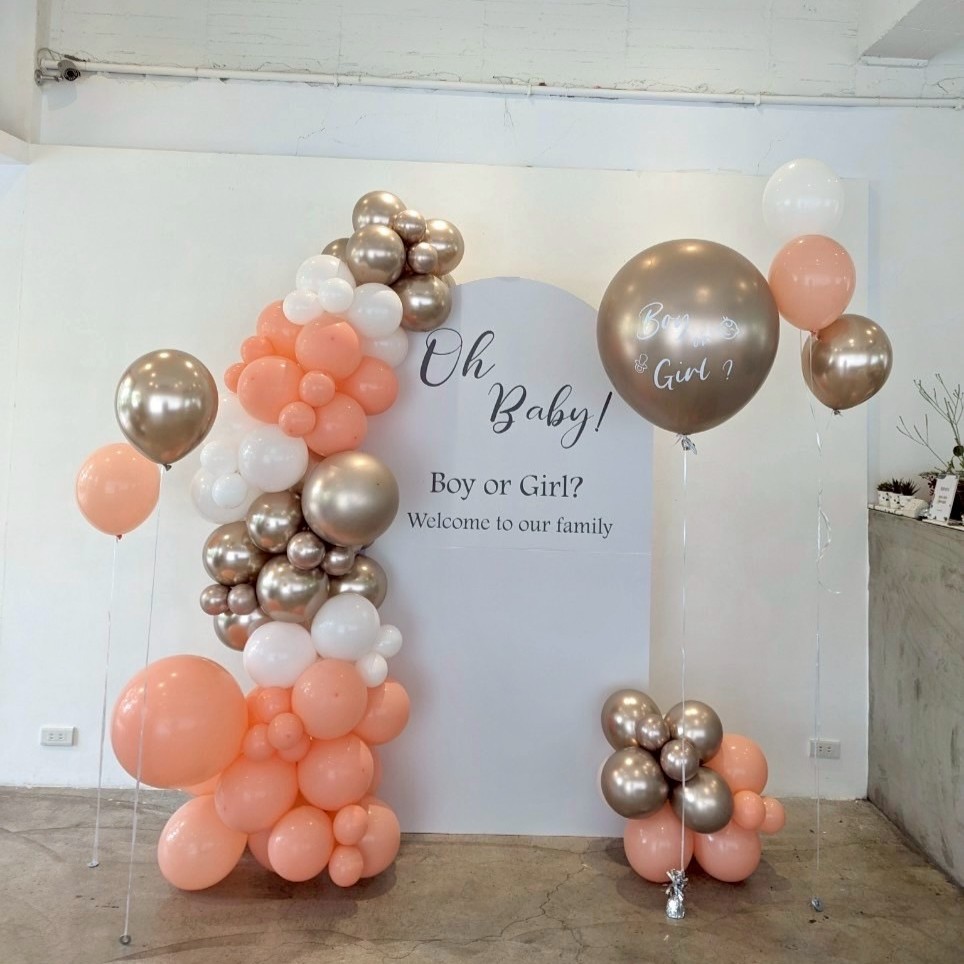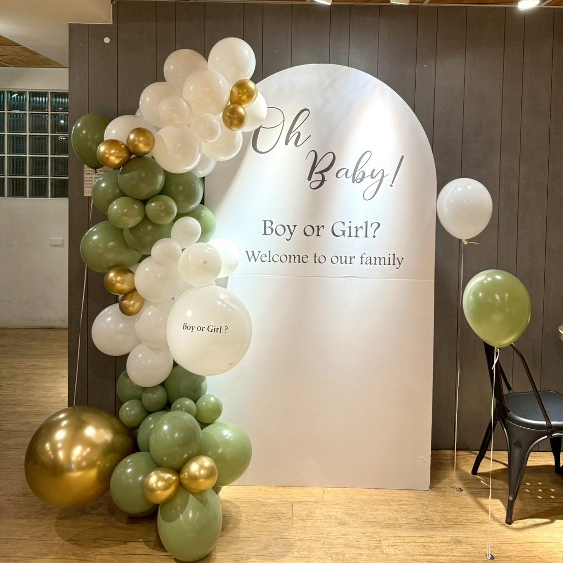 佈置包含: 200公分高公版租借背板一塊 (顏色&文字皆不可更改) 210+60公分球鏈 36吋 空飄性別揭示球*1 (包含貼字+戳破棒一隻) 12吋空飄乳膠球*5顆