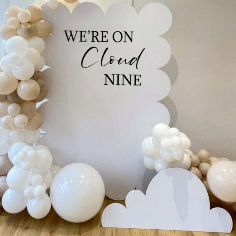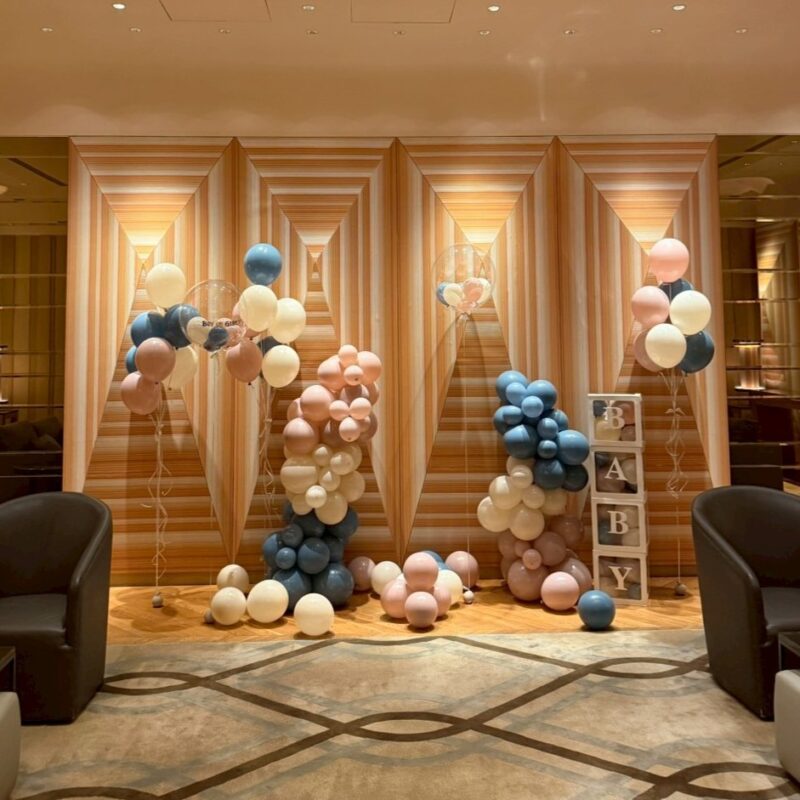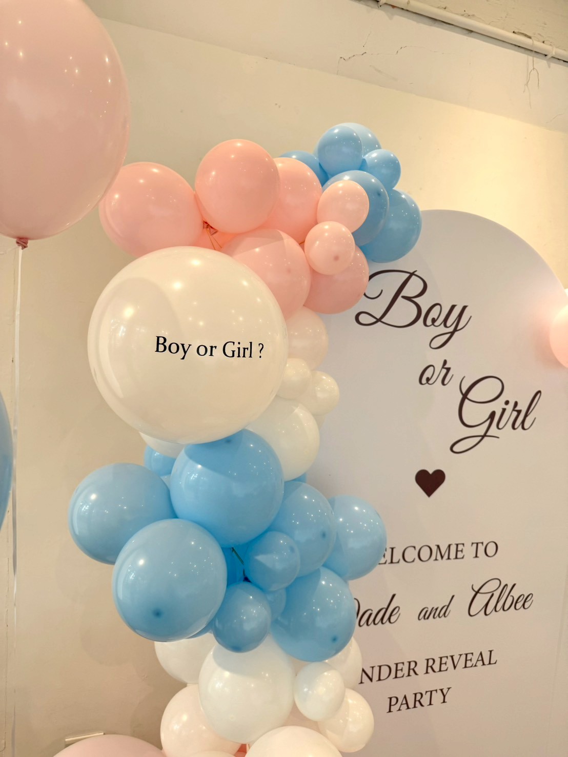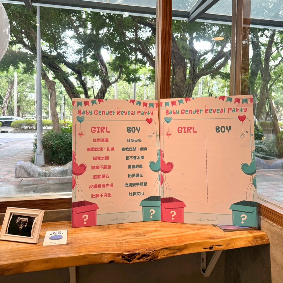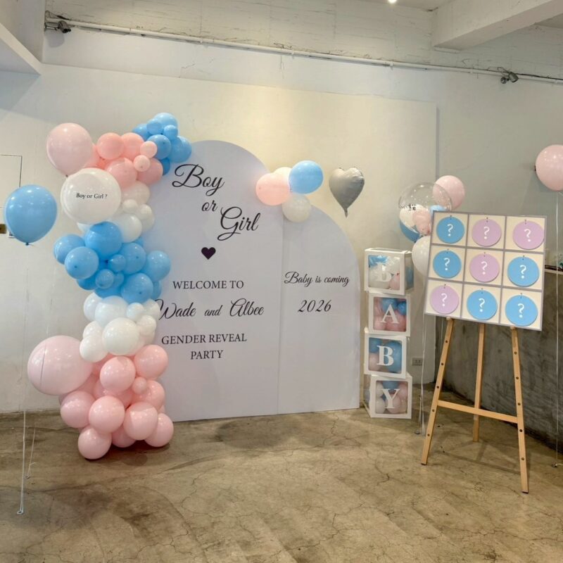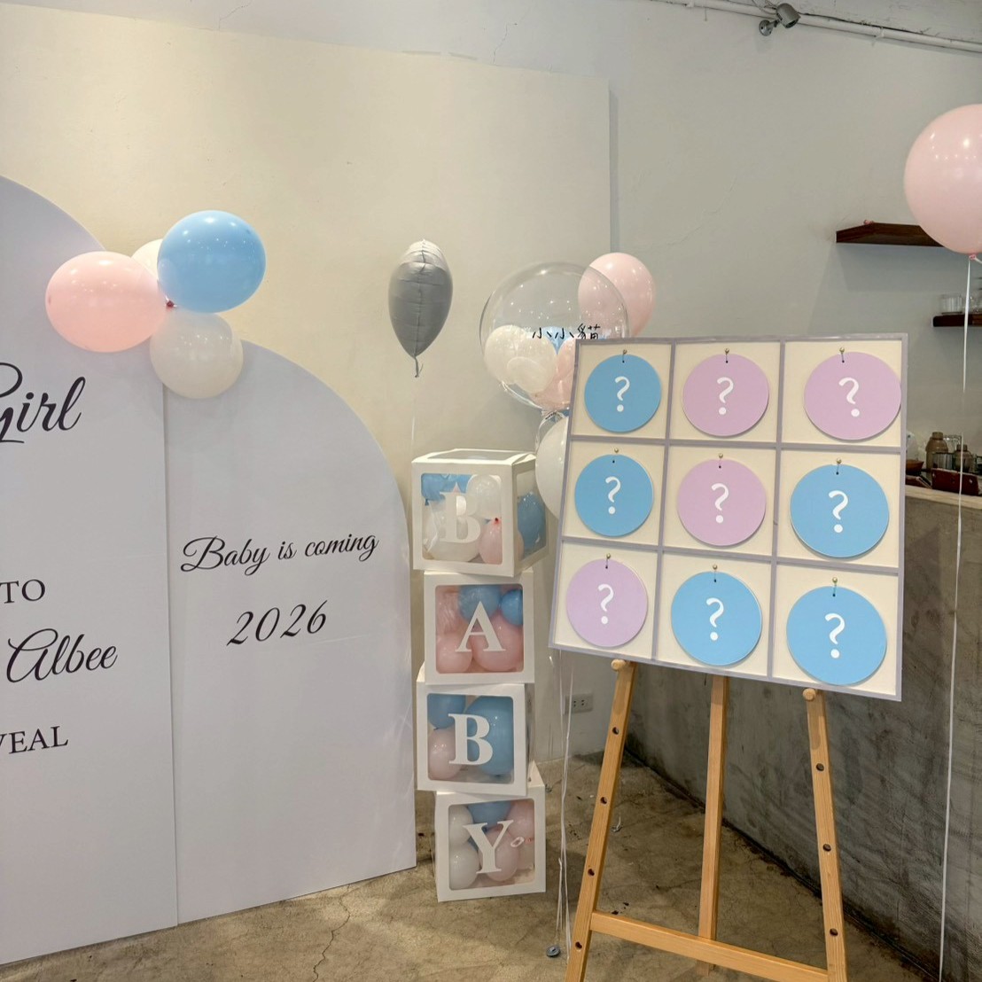 佈置包含: 200cm+160cm高客製化背板*2(包含設計+輸出+架設) 不規則球鏈*1 雙面印刷九宮格性別連線板 公版猜猜版+孕期特徵板各1塊 BABY字母盒(含小球) 空飄 12寸乳膠球*7顆 20寸波波球中球*1 含貼字 18寸鋁箔愛心*3