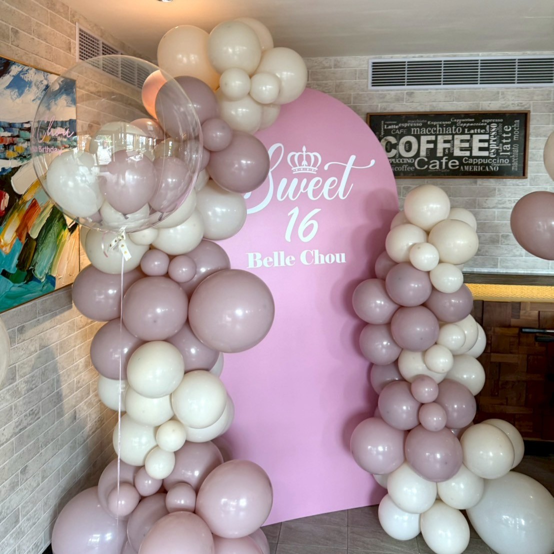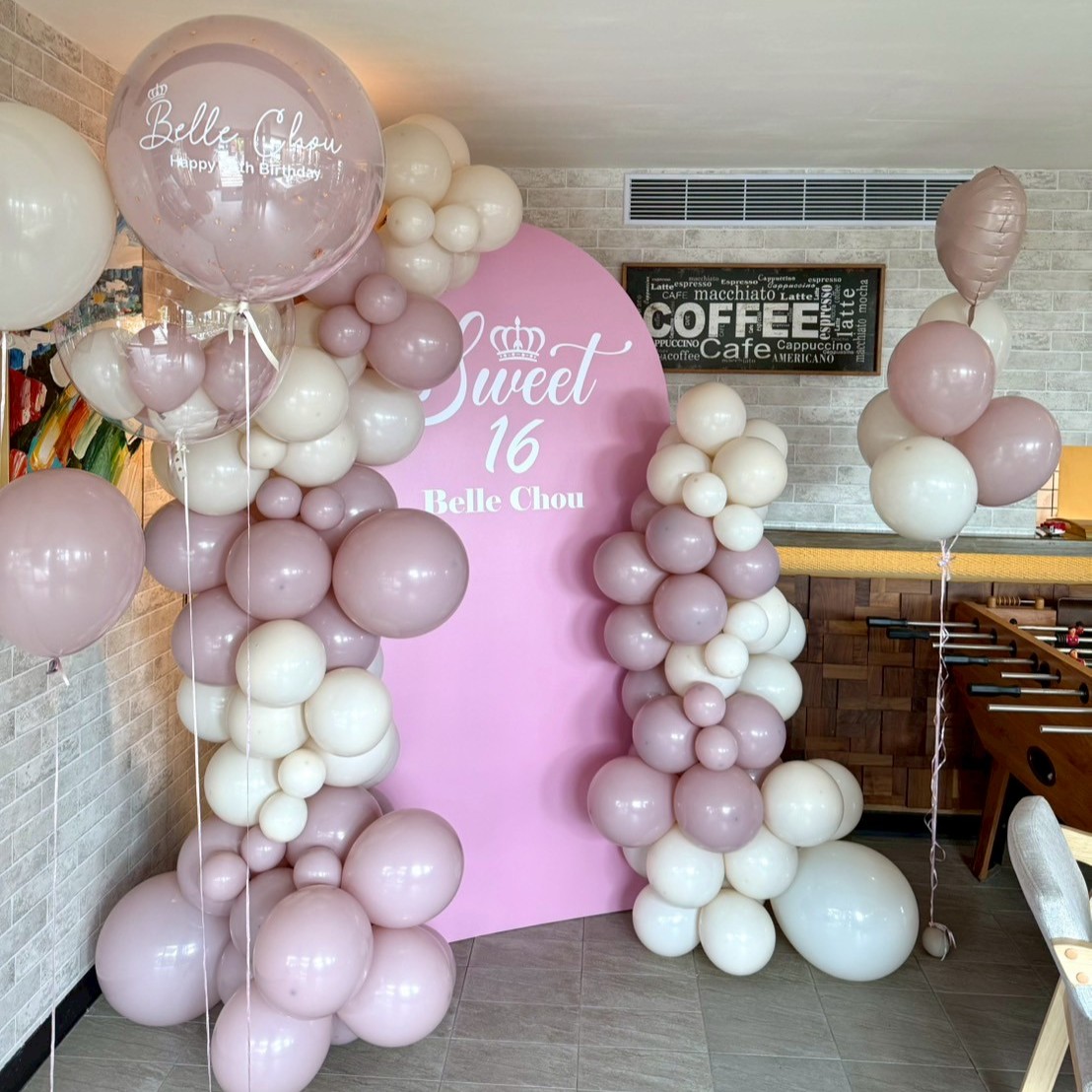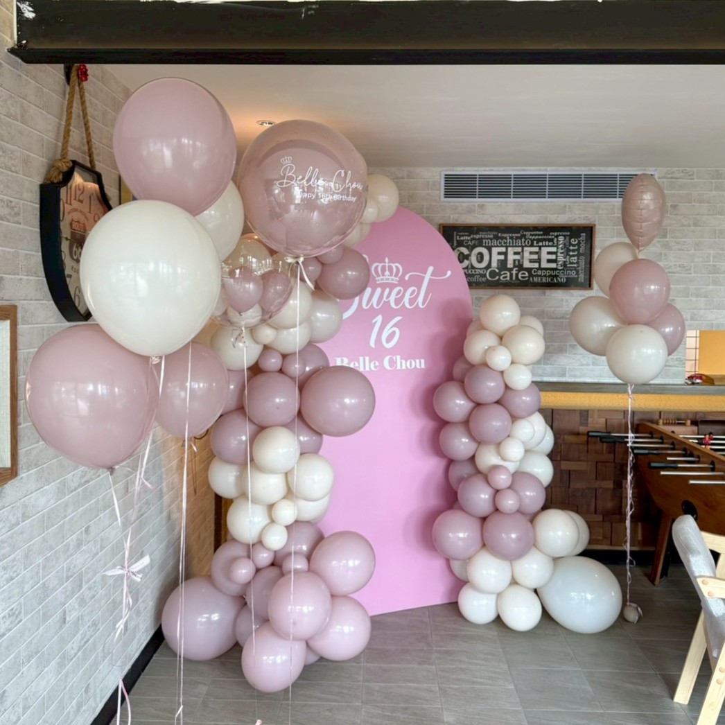 16 歲是青春最甜美的年紀。用粉紫與奶白色氣球堆疊出夢幻仙境。