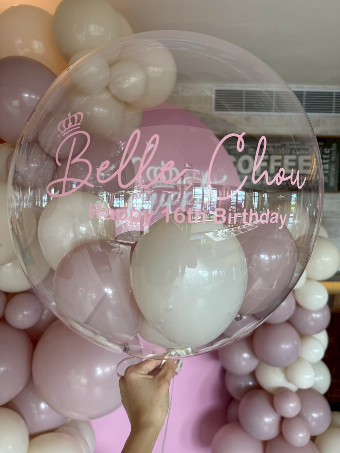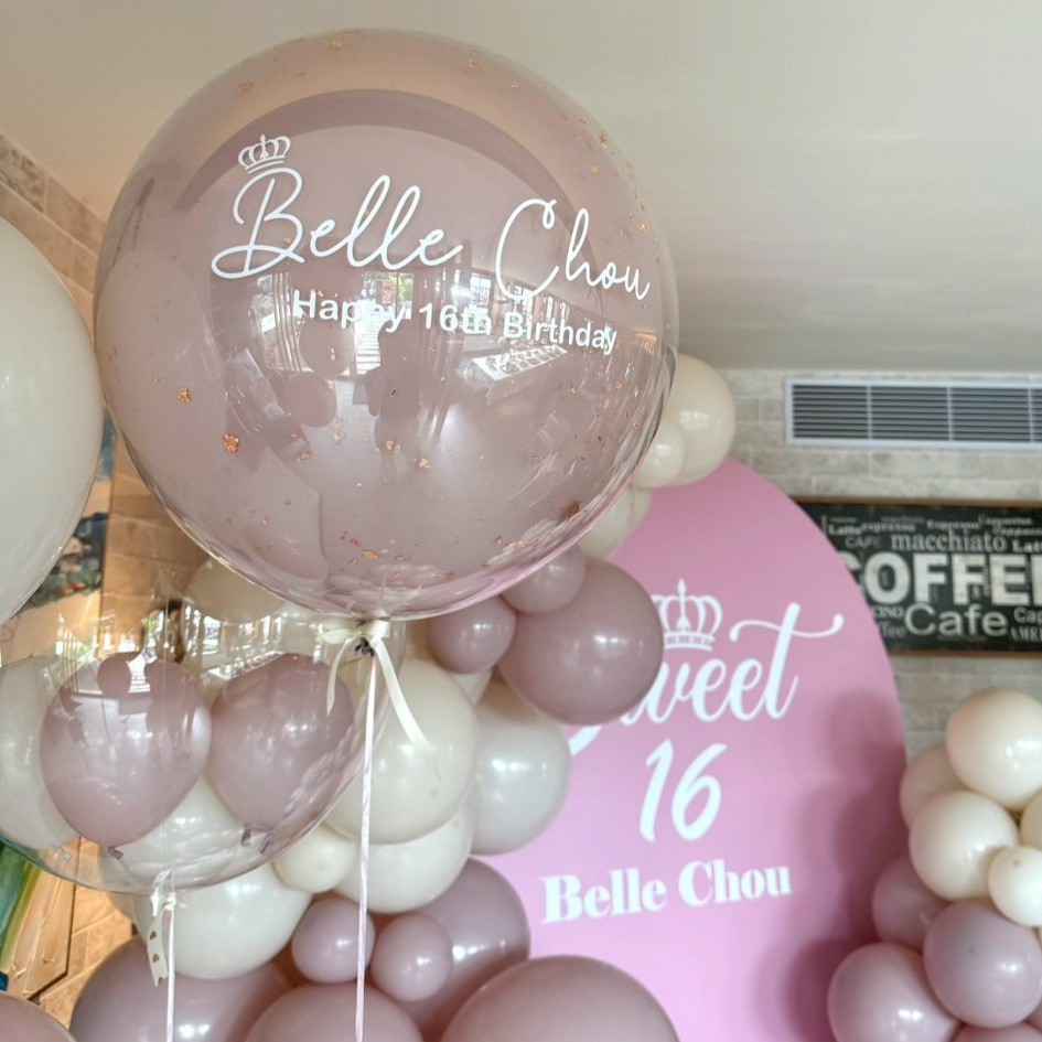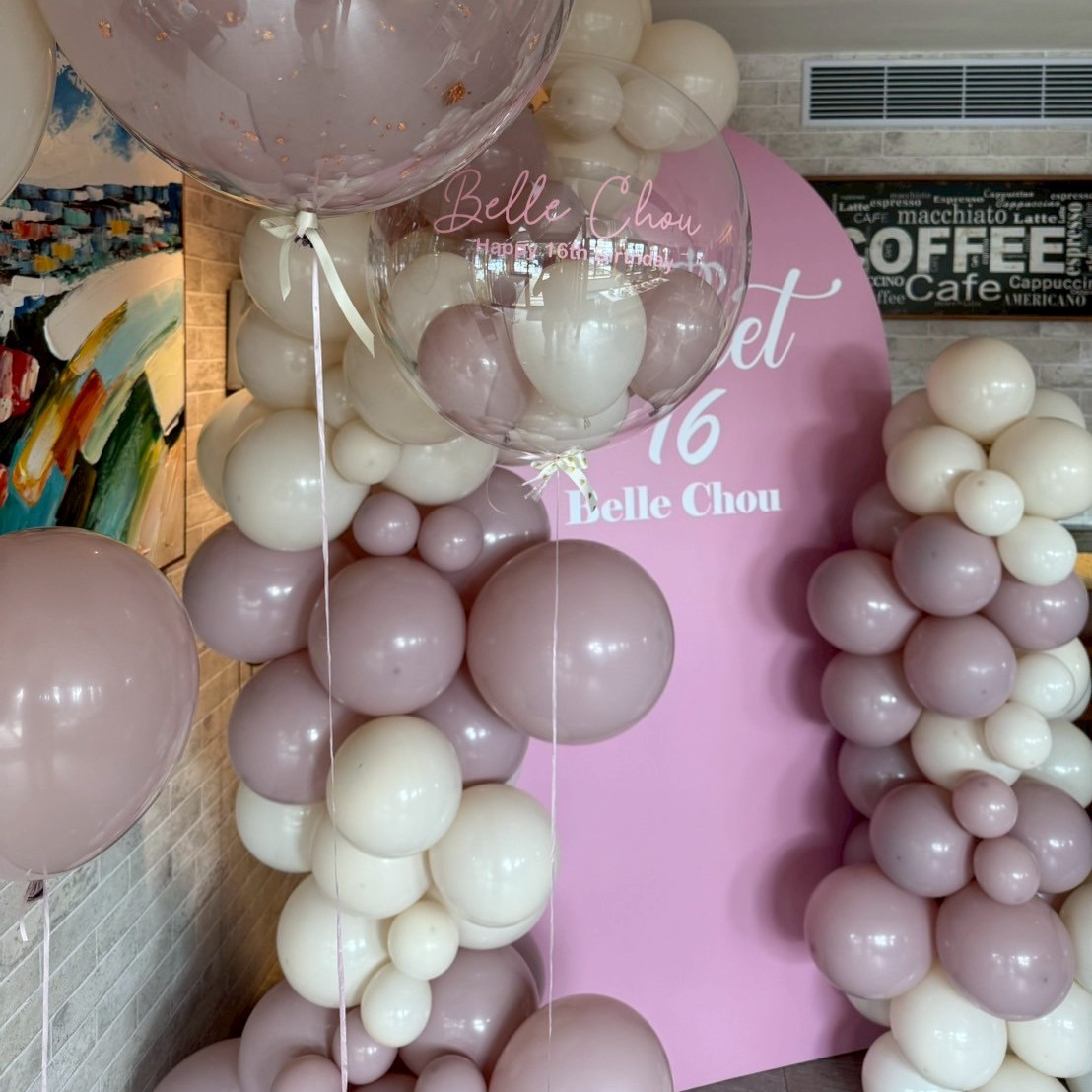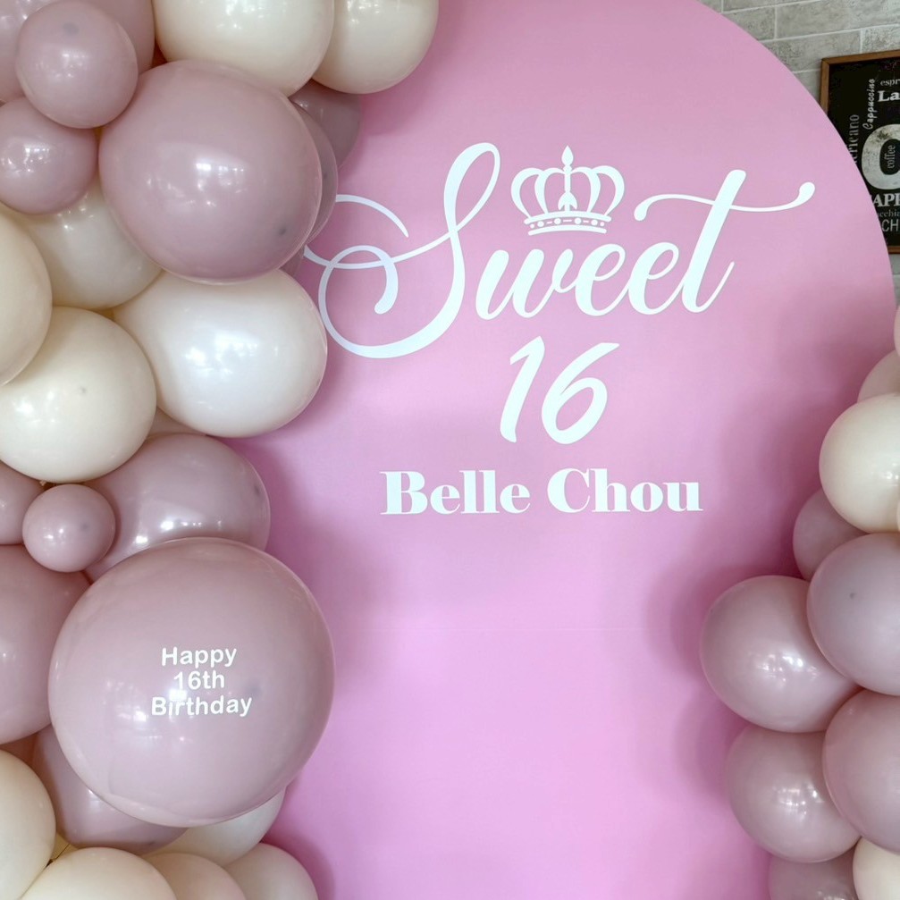 16 歲是青春最甜美的年紀。用粉紫與奶白色氣球堆疊出夢幻仙境。
